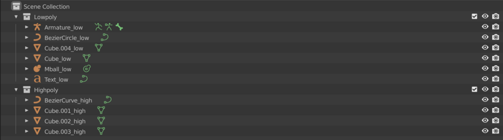 - Sort to collections - Creates two collections called Highpoly and Lowpoly, then adds selected _low objects to the lowpoly collection and _high objects to the highpoly collection.