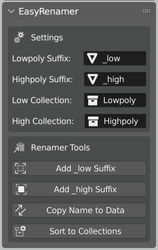 - The lowpoly and highpoly suffix's and the lowpoly and highpoly collection names are configurable and can be changed in the "settings" section.